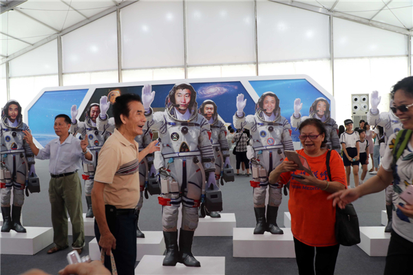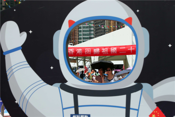 6月29日,航天员杨利伟、景海鹏和陈冬的形象板吸引香港市民留影。