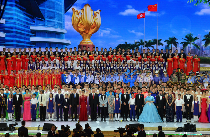 昨晚,庆祝香港回归祖国20周年文艺晚会在香港会展中心举行。图为演出尾声,国家主席习近平以及梁振英、林郑月娥等一同上台与演艺人员高声合唱《歌唱祖国》。记者 冯俊文 摄