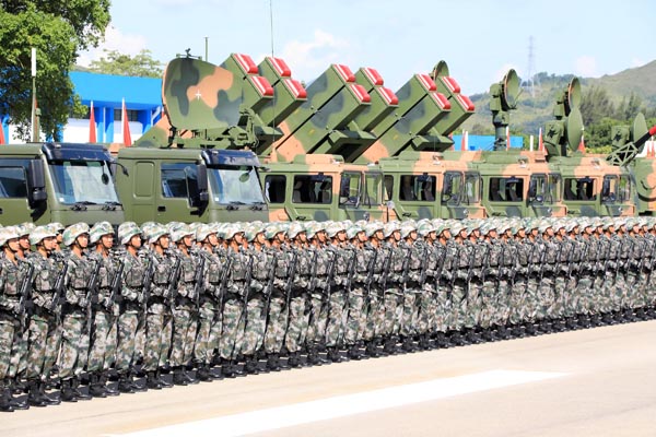 受閱的20個方隊包括:軍樂隊、儀仗方隊(包括了女儀仗隊員)、陸軍方隊、海軍方隊、空軍方隊、陸軍學兵方隊、海軍學兵方隊、空軍學兵方隊、步兵方隊、女兵方隊、特種兵方隊、3個裝甲兵方隊、通信兵方隊、工程防化兵方隊、后勤裝備方隊、防空導彈方隊、直九直升機方隊、直八直升機方隊。