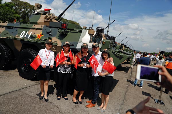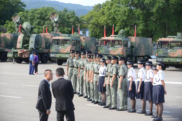 軍樂隊奏響雄壯的閱兵曲。習近平乘車依次檢閱駐香港部隊20個方隊。3100餘名受閱官兵軍容嚴整、意氣風發,防空導彈、輪式裝甲車、武裝直升機等武器裝備整齊列陣、威風凜凜。「同志們好!」「主席好!」「同志們辛苦了!」「為人民服務!」習近平的親切問候鼓舞士氣,官兵們響亮的回答聲震長空。觀禮台上不時響起熱烈掌聲。