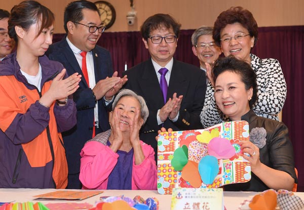 在中心的復康治療室內,彭麗媛聽取職業治療師介紹如何應用先進復康儀器為長者治療訓練,了解老人康復治療情况。隨后,她又參觀院內住宿設施「朗逸居」和探訪院友,向負責護士了解院友日常的生活情况。在中心禮堂,一些老人正在繪畫、制作手工,彭麗媛走到他們身邊觀看,與參加繪畫及手工藝活動的長者交談,稱赞他們的晚年生活豐富多采,她并與多位長者一起制作立體卡——一個造型精美的立體捧花卡。