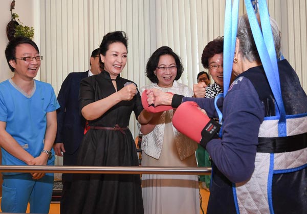 在參觀中心的復康治療室內時,彭麗媛聽取職業治療師介紹,如何應用先進復康儀器為長者治療訓練。彭麗媛更稱赞一位正在以拳擊進行物理治療的婆婆,并跟她說:「你好棒」、「好厲害」,更親切地用廣東話赞阿婆:「好勁啊。」
