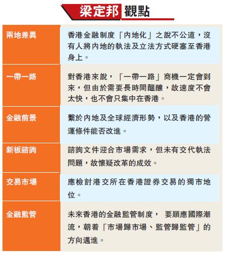 香港金融業的成功,建基於兩地合作以及中央確立香港作為人民幣離岸中心的地位。不過,梁定邦認為,回歸20年以來,內地與香港在商業行為監管方面仍有不暢順的地方,而這源於兩地制度的差異:「內地有好多不同的執法隊伍,例如中證監查案時,需財政部、公安和地方政府等多方幫助,但香港在金融市場的監察權力則集中於香港證監會。」