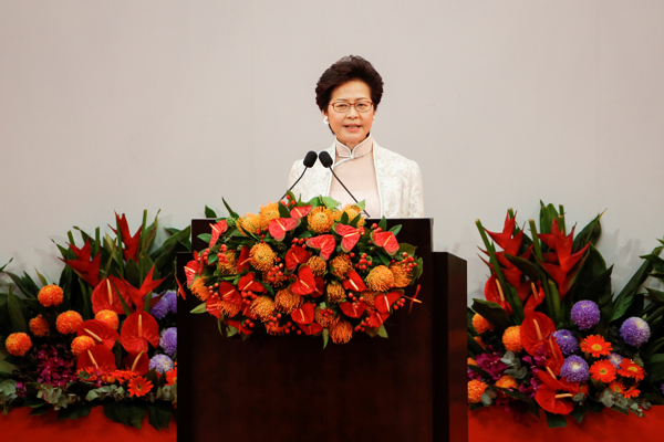 今天是香港回歸祖國20周年的重大日子,我在國家主席監誓和各位見證下,就任中華人民共和國香港特別行政區第五任行政長官。此刻我懷著謙卑的心情,接受我人生中的最大榮耀,並准備好應對我公務生涯中的最大挑戰。未來五年,我會帶領管治團隊,以具體的工作和紮實的政績,答謝市民和中央人民政府對我的信任和支持。
