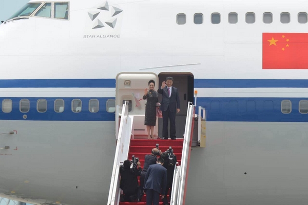 :習近平主席與夫人彭麗媛進入機倉前揮手向在場人士道別。