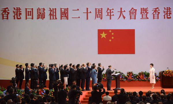 昨上午9時許,在國家主席習近平監誓下,林鄭月娥舉起右手莊嚴宣誓:「本人就任中華人民共和國香港特別行政區行政長官,定當擁護中華人民共和國香港特別行政區基本法,效忠中華人民共和國香港特別行政區,盡忠職守,遵守法律,廉潔奉公,為香港特別行政區服務,對中華人民共和國中央人民政府和香港特別行政區負責。」習近平其后再為新班子及行政會議成員監誓。