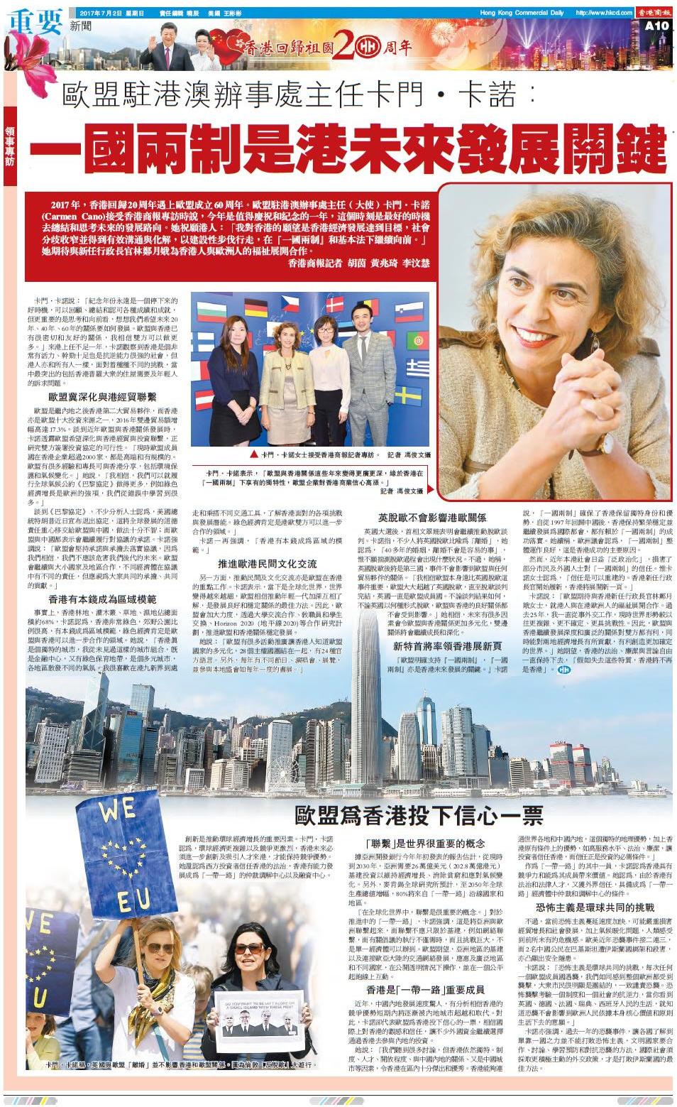 2017年,香港回歸20周年遇上歐盟成立60周年。歐盟駐港澳辦事處主任(大使)卡門‧卡諾(Carmen Cano)接受香港商報專訪時說,今年是值得慶祝和紀念的一年,這個時刻是最好的時機去總結和思考未來的發展路向。她祝願港人:「我對香港的願望是香港經濟發展達到目標,社會分歧收窄並得到有效溝通與化解,以建設性步伐行走,在『一國兩制』和基本法下繼續向前。」她期待與新任行政長官林鄭月娥為香港人與歐洲人的福祉展開合作。