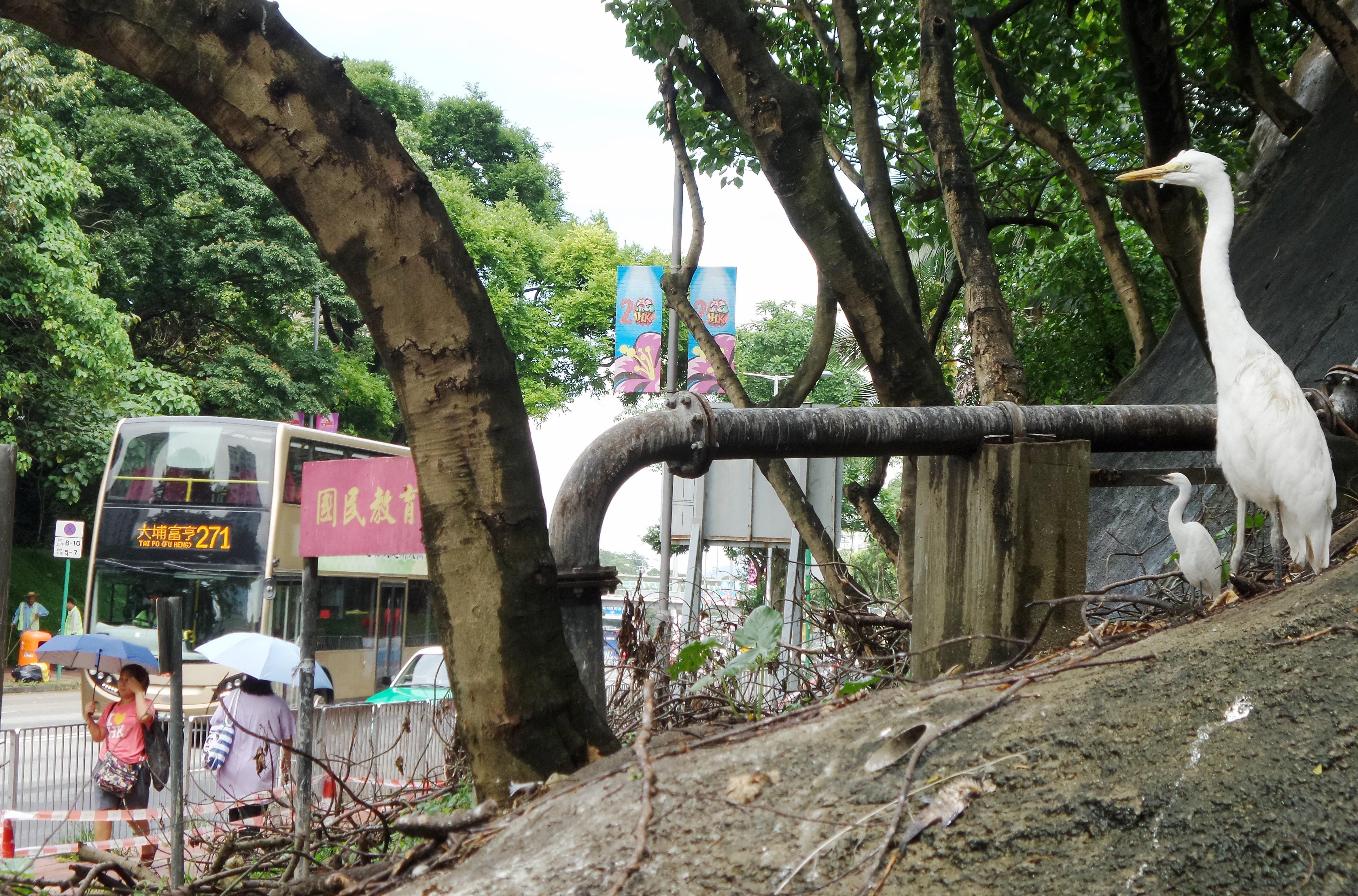 大埔運頭角里路口的富景大廈低層單位窗戶與西側的鷺鳥林遙遙相對,近在咫尺,所見大白鷺(黃喙)、小白鷺(黑喙)、池鷺及夜鷺等在樹林栖息。有關團體統計樹梢上有150餘個鳥巢,成年鷺鳥整天飛來飛去,似乎接受這些新鄰居,有住戶笑笑地表示,暫時相安無事。然而,鷺鳥林北側鄰近的廣福道行人路卻現一幅慘景。6月27日記者所見,行人路旁橫豎擺放着被康文署外判工斬下的樹枝,仍未清理。地區人士指,因樹枝上還有較完整的鳥巢,能行路的幼鳥仍在此等待鳥媽媽餵食,現場亦見白鷺母子。