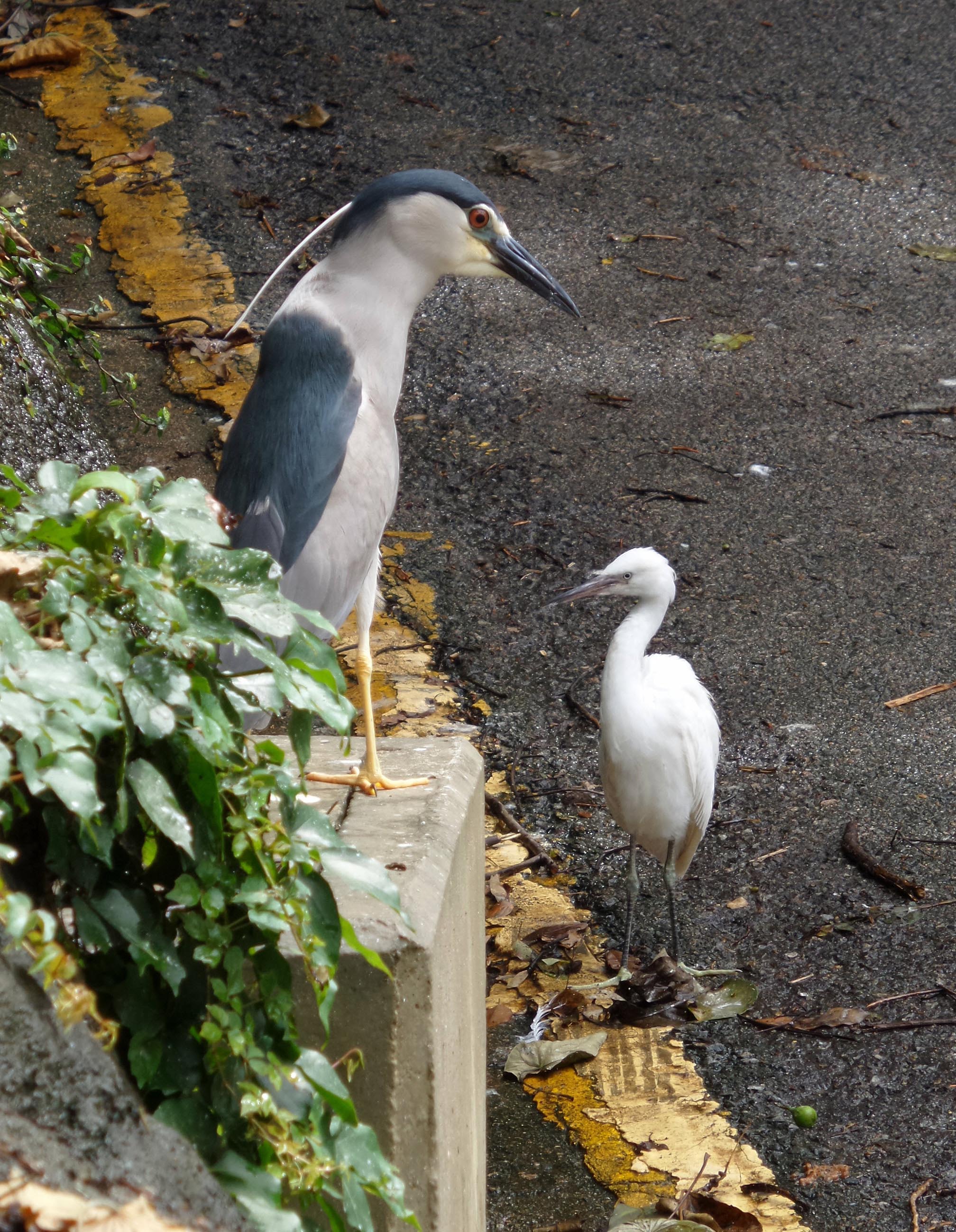 夜鷺(左)、小白鷺(右)在路邊歇腳不知險。