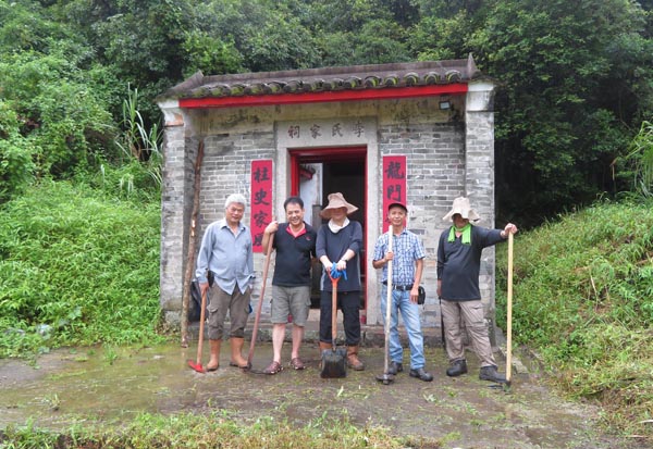 李國強(左二)及李志雲(右二),與村民不時清理祠堂前方禾堂的雜草,方便村民走動。記者 鄭玉君攝
