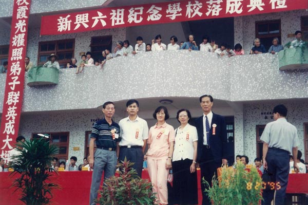 呂烈與太太(右二),好友劉焯榮(左一)及成員參加寶蓮寺興建的首間希望工程——廣東雲浮市新興縣六祖學校落成典禮。