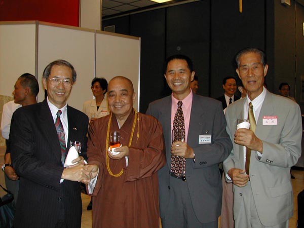 2000年9月工聯會酒會上,呂烈(右一)與前中聯辦主任助理王如登(左一)、寶蓮寺釋智慧法師(左二)及工聯會前內地諮詢服務中心任總主任蘇萬興(左三)合照。圖片蘇萬興提供