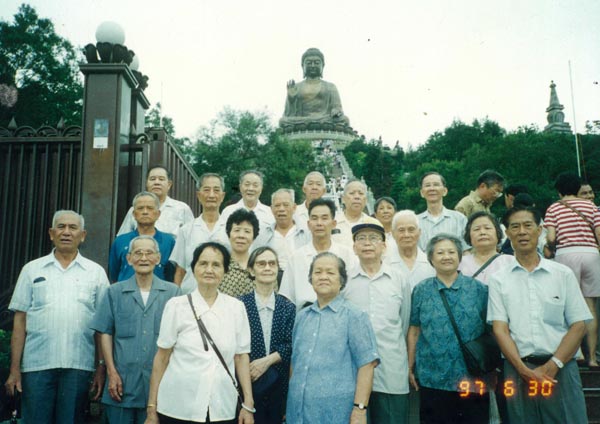 呂烈(前排右一)在回歸前與前抗日港九大隊大嶼山中隊戰友參觀天壇大佛。圖片由呂烈家人提供