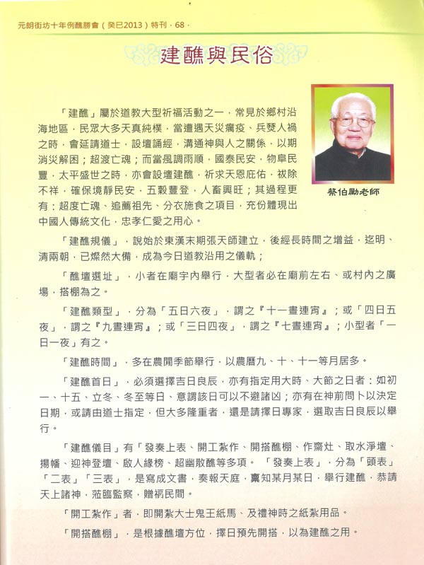 鄉鎮慶典特刊內容多樣,如元朗街坊十年例醮勝會2013特刊,有曆學大師蔡伯勵文章《建醮與民俗》。