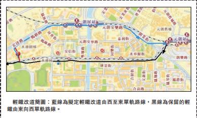 另外,輕鐵改道,相信對於在大棠站周邊生活的居民更是造成不便,相信佔約三成的街坊受影響。他指出,如果是單純改道措施無助於元朗大馬路的交通改善,其因,仍有輕鐵單軌在元朗大馬路上,輕鐵於各站紅燈位及各路口紅燈位並未取消,行人、車輛都會滯留於各個燈位,元朗大馬路上車輛使用效率並未提升,除非於元朗大馬路增加幾座行人天橋,才有可能改善。