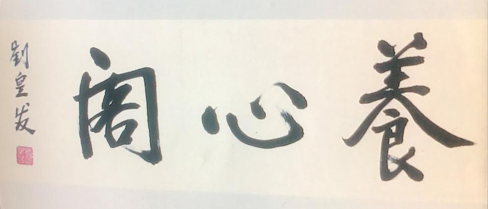我們不要真的以為劉皇發是個鄉下人,沒有受過什教育,發叔的啟蒙教育是在私塾學習古書,他上課的第一天,循古例要上香拜孔子。有時候我用錯了成語,還得他及時糾正。他是有書法功底的,在發叔屯門的辦公室,有一張書桌,上面放文房四寶和一卷宣紙,當他處理公務之閒暇,就提筆練字,我珍藏一副他的墨寶。