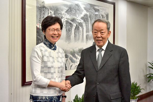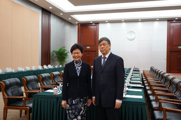 行政長官林鄭月娥(左)昨日下午在京與國務院港澳辦主任王光亞(右)會面。政府新聞處