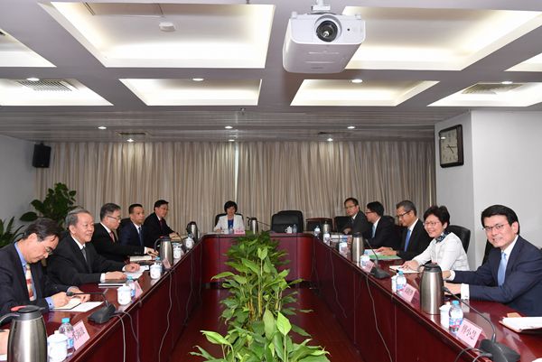 摃行政長官林鄭月娥(左二)昨早會見中國鐵路總公司總經理陸東福(右三)。記者敖雷攝