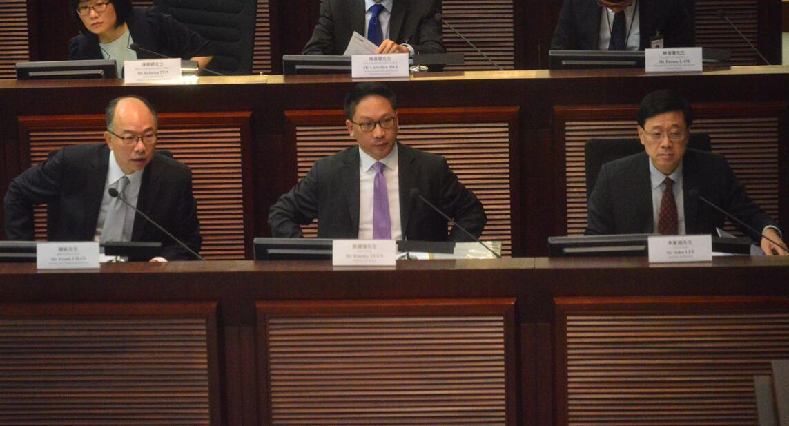 律政司司長袁國強(中)、運房局局長陳帆(左)及保安局局長李家超(右),昨出席立法會事務委員會聯席會議解釋「一地兩檢」方案。記者 馮俊文攝