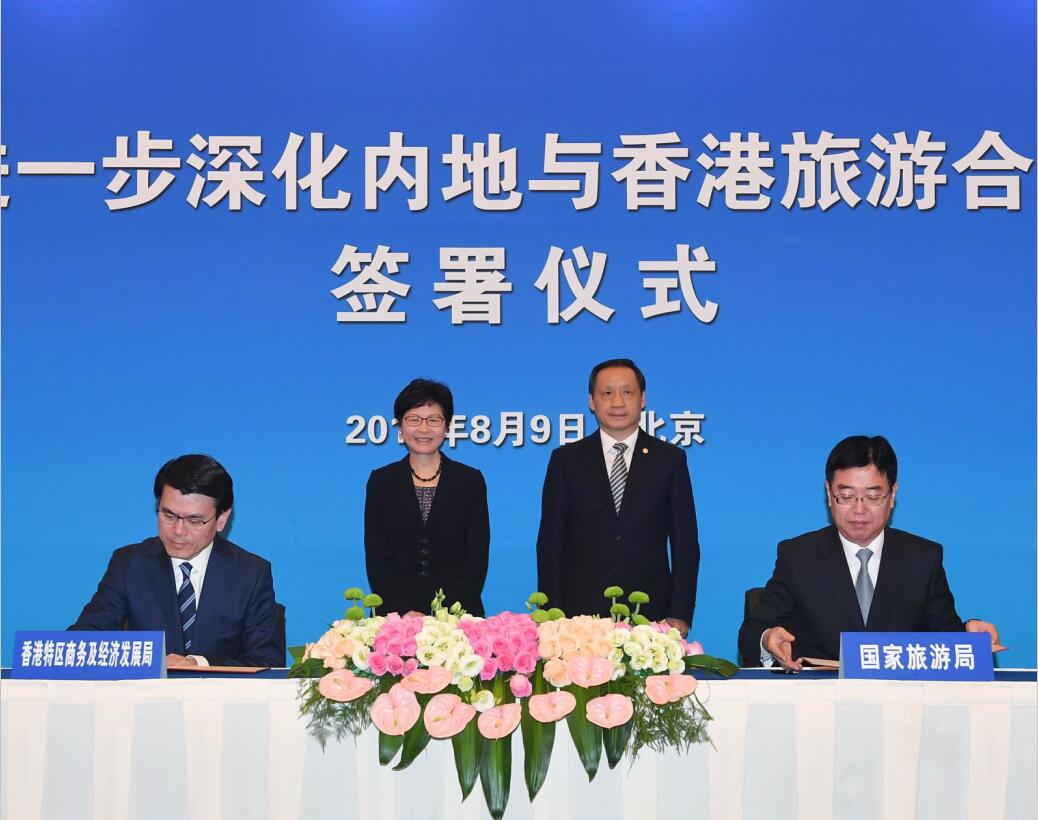林郑月娥(左二)与国家旅游局局长李金早(右二)见证深化旅游合作协议签署仪式。