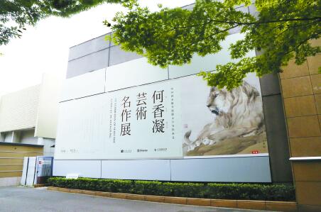 日本東京上野之森美術館外牆張貼著何香凝藝術精品展覽大幅海報。