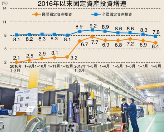 【香港商報網訊】在去年61萬億元投資規模上,今年1至8月全國固定資產投資增長維持在7.8%的平穩增速,投資仍然是支撐經濟平穩運行的主要力量。經濟增長維持在6.9%的中高速,但在投資增速呈現穩中略緩的態勢中,高技術產業同比增長17.8%,新動能和轉型升級投資活躍,表明十八大以來的發展新理念——從要素驅動、投資規模驅動發展為主,向以創新驅動發展為主的轉變,速度正在加快。與此同時,民間投資增速經過去年上半年的回落,今年1至8月出現了明顯的回升勢頭,同比增長6.4%,占全部投資的比重為60.7%,表明簡政放權、放管結合、優化服務等全面深化改革的紅利開始呈現,民間投資已成構建繁榮的基本力量。香港商報記者 曲直