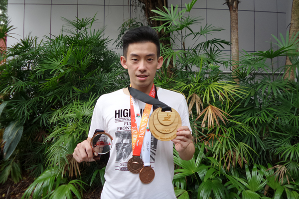 ▲應記者要求,黃鎮廷展示部分國際乒球賽獎牌。 記者 周駿攝
