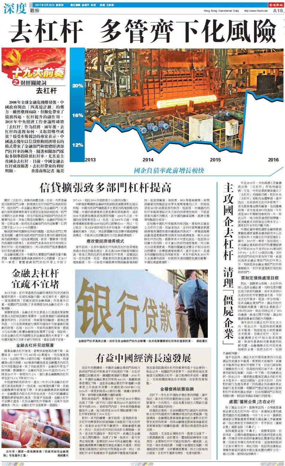 2008年全球金融危機爆發後,中國政府開出「四萬億計劃」的藥方。雖然藥到病除,但難免帶來了債務四起,杠杆提升的副作用。2015年中央經濟工作會議明確將「去杠杆」作為任務。兩年後,去杠杆的進程如何,又取得哪些成效?接受本報採訪的專家表示,中國過去幾年以信貸推動經濟增長的模式帶來了金融部門和實體經濟部門杠杆率的飆升。隨著相關部門採取多個舉措降低杠杆率,尤其是主攻國企去杠杆。目前,中國金融去杠杆成效顯著,去杠杆帶來的利好明顯。香港商報記者 施美