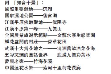近年來,蔡甸區按照「五位一體」總體布局,結合生態資源和知音文化傳承,努力打造「全域旅游、健康蔡甸、知音故里、生態新城」的旅游品牌,成功推出了「知音十景」,如今,「知音十景」已成為中法武漢生態示範城重要的文化旅游名片。