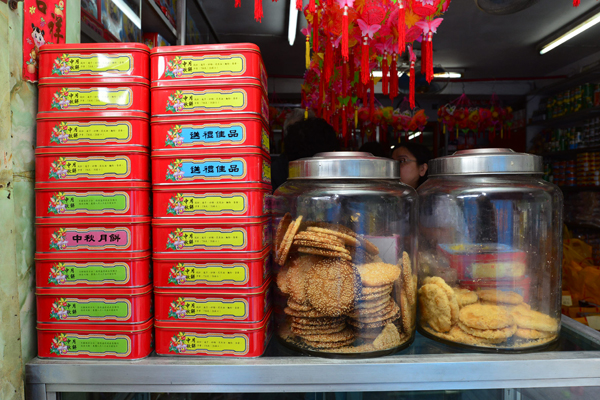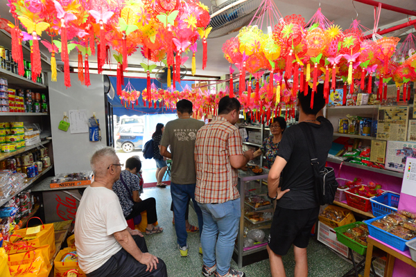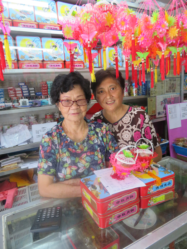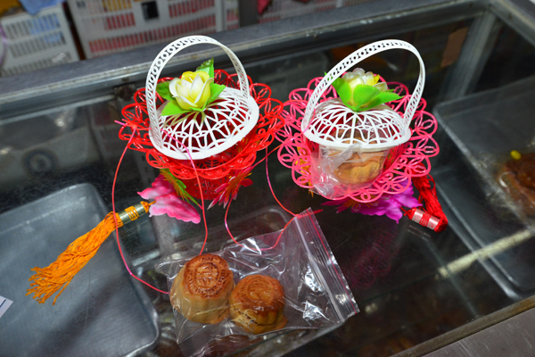 臨近中秋,買餅客人很多,店里也挂上極有中秋氣息的花籃仔。