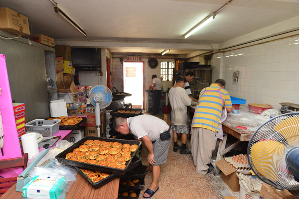 4名師傅(廚房后方站立者)在舊老闆一聲「幫手」下,中秋忙整餅。記者馮俊文攝