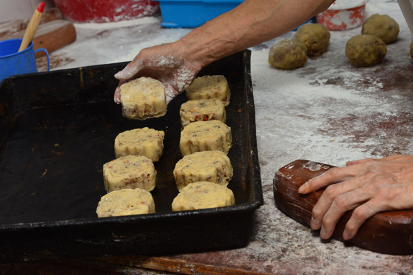 月餅由木制餅模打出才拿去焗,這過程頗吃力。