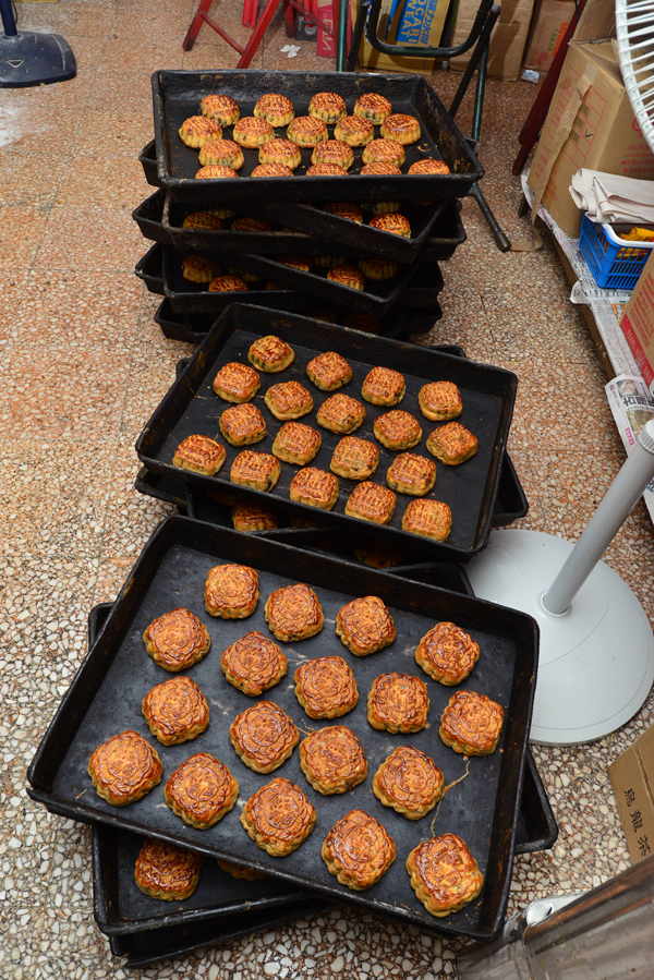 負責焗月餅的是葉師傅,他將一盤18個焗好的月餅放下后,即刻放進另一盤入焗爐,焗20分鐘后拿出,這焗制過程一天里做很多次,這天他說會做80次,記者聽了這個數目后嚇了一跳,在這個既熱且焗的廚房……,但見七旬的葉師傅很有效率地將月餅放進焗爐再拿出,氣不喘,腳不浮,不禁心生佩服。