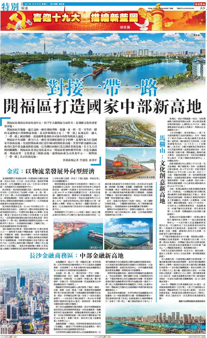 開福區平台廣闊、潜力巨大,擁有多項國家級的金字招牌,近幾年致力打造國家中部新高地。金霞經開區成功打造中國內陸開放新高地,芙蓉中路金融核心區成功打造中部金融商務新高地,泛馬欄山區擬打造文創產業新高地。在十九大召開的關鍵點,開福區區委書記沈裕謀表示,開福區要加快轉型升級,打造金融商務、物流商貿、文化創意三個新高地,讓開福區成為長沙北中心,一個對接「一帶一路」真正的新高地。香港商報記者 肖建花 唐勇平