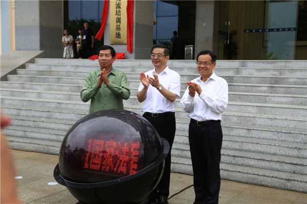 2017年6月9日,中华人民共和国首席大法官、最高人民法院院长周强(中)、广西壮族自治区政府主席陈武(右)老挝人民民主共和国最高人民法院院长坎潘·西提丹帕(左)一起为中国—东盟国家法官交流培训基地和法律与司法信息中心揭牌(黄明强摄)
