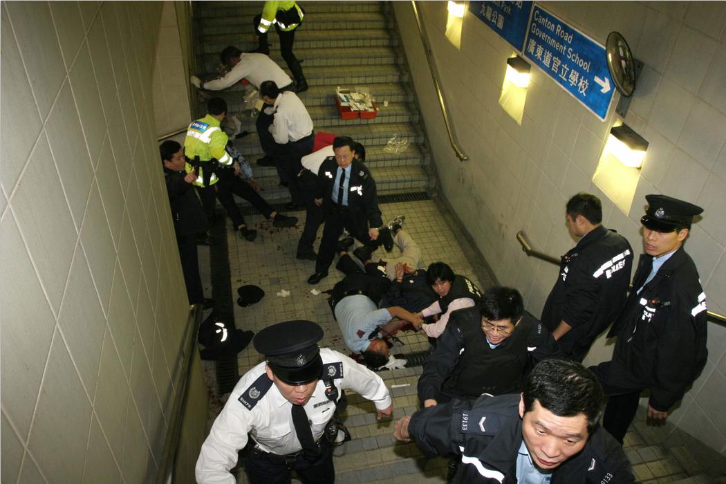 2006年3月16日凌晨,廣東道與柯士甸道暗角的行人隧道殺警案發生後,大批警察在現場搶救及調查。 本報資料圖片