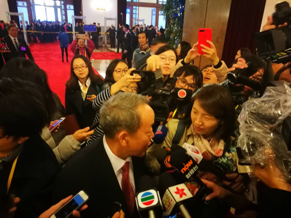 沒跑出港記包圍的前港澳辦主任王光亞 (特派記者劉曉東攝)