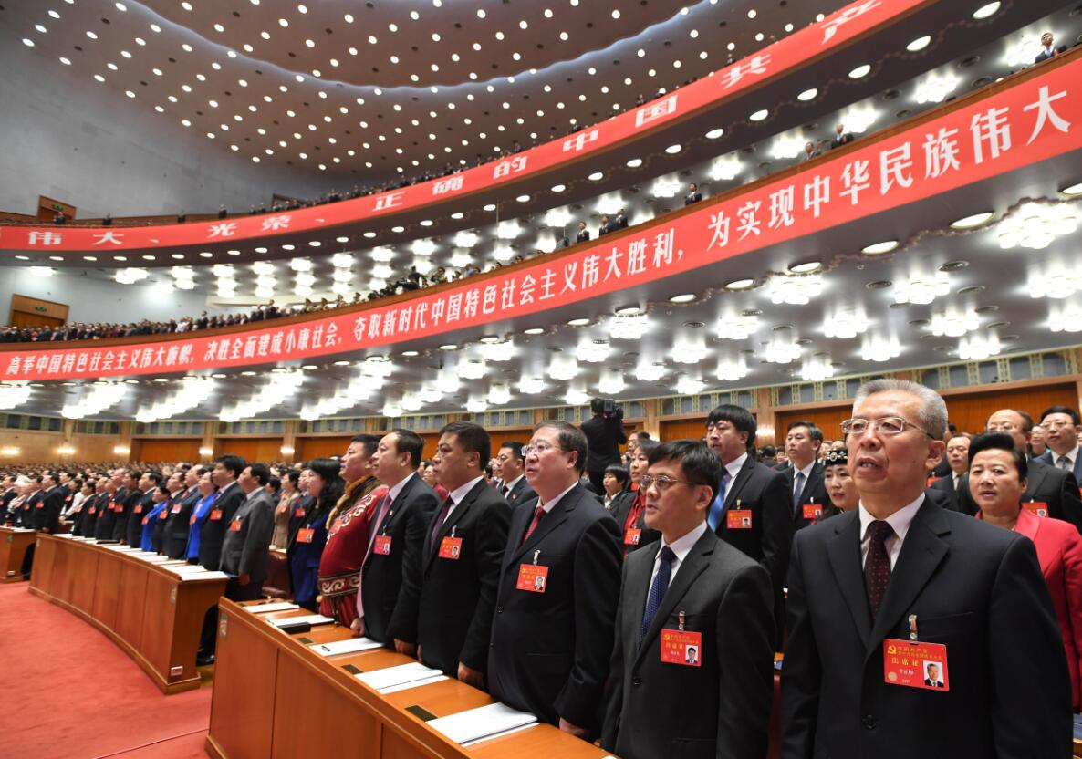 十九大在北京人民大会堂隆重开幕,会场内与会代表高唱国歌。新华社
