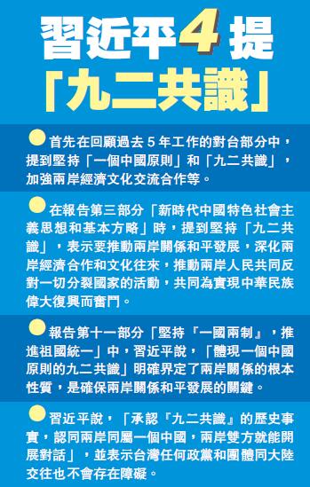 回顧過去5年涉台工作取得的新進展,習近平指出,堅持一個中國原則和「九二共識」,推動兩岸關系和平發展,加強兩岸經濟文化交流合作,實現兩岸領導人歷史性會晤。妥善應對台灣局勢變化,堅決反對和遏制「台獨」分裂勢力,有力維護台海和平穩定。