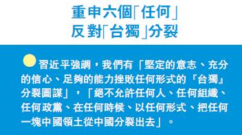 習近平強調,我們堅決維護國家主權和領土完整,絕不容忍國家分裂的歷史悲劇重演。一切分裂祖國的活動都必將遭到全體中國人堅決反對。我們有堅定的意志、充分的信心、足夠的能力挫敗任何形式的「台獨」分裂圖謀。我們絕不允許任何人、任何組織、任何政黨、在任何時候、以任何形式、把任何一塊中國領土從中國分裂出去!