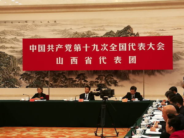 山西團審議十九大報告。會議開始前,山西省省委書記駱惠寧,山西省省長樓陽生,山西省省委副書記黃曉薇先來到記者采訪區,與各位記者一一握手致意。(特派記者 劉深攝)