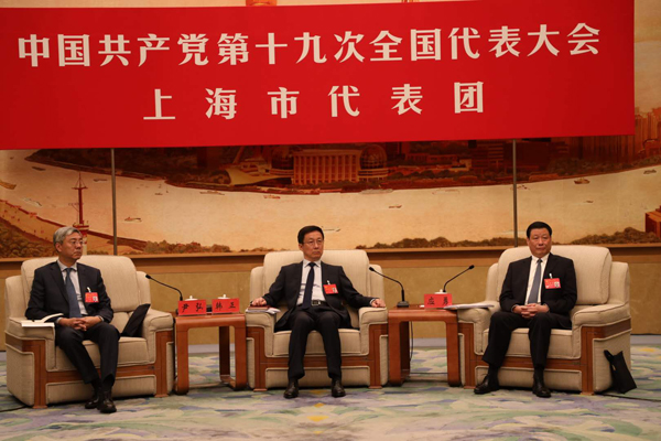 上海團開放受到媒體的熱烈追捧,現場爆滿。上海市市委書記韓正,上海市市長應勇,上海市市委副書記尹弘正在聽取上海市市委常委、常務副市長,同時也是張江高新技術產業開發區管委會主任的周波彙報上海科技創新產業的成績。(特派記者 刘深攝)