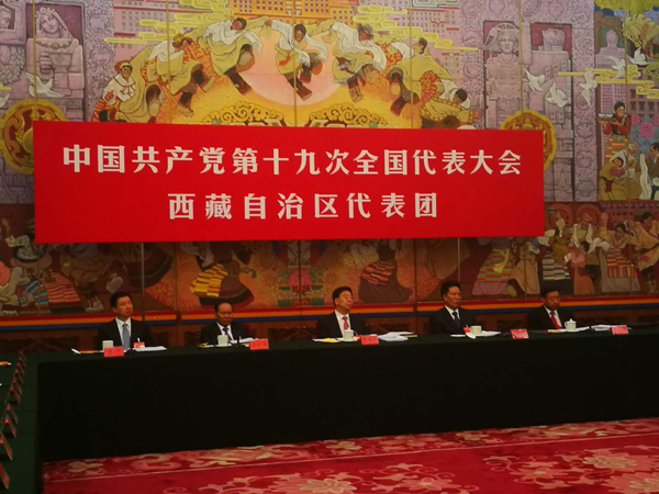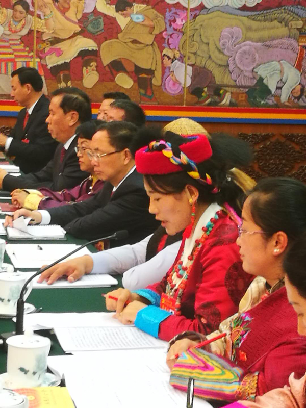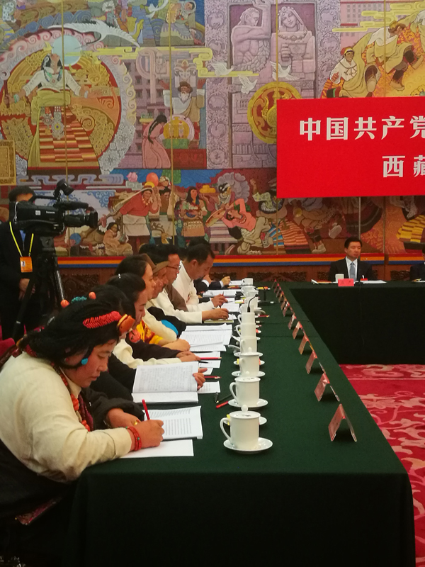 西藏團,主持人(中)為自治區党委书记吳英傑,右二是十八屆七中全會遞補為中央委員的自治區人大主任洛桑江村。
