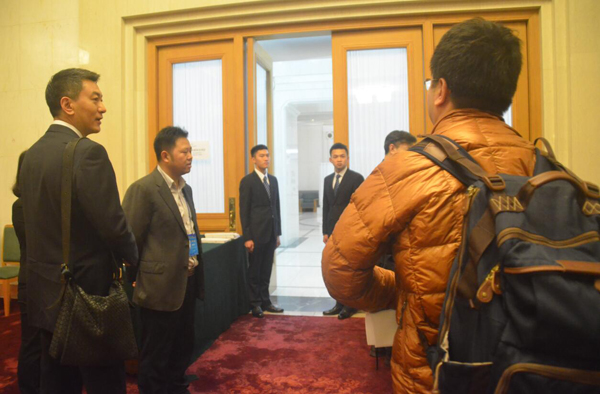 重慶廳外央視主持人魯健被攔,排隊進入。(特派記者 李穎攝)