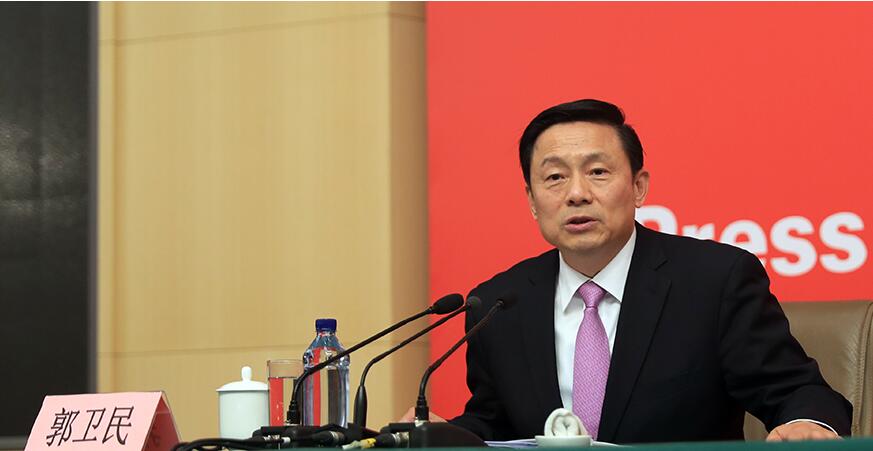 图为大会新闻发言人、国务院新闻办公室副主任郭卫民向与会记者介绍情况。新华网 郝广鹏摄