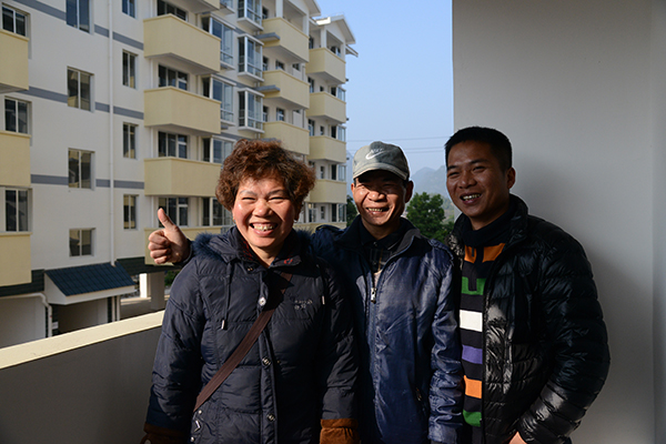 分到房子后高兴的侨民一家,他们的身后就是即将可以入住的新房。