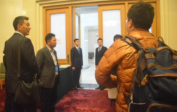 重庆厅外央视主持人鲁健被拦,排队进入。香港商报特派记者摄
