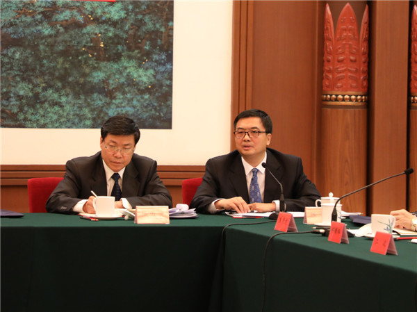 中共十九大代表、雄安新區黨工委書記陳剛(右)昨日在河北團開放日上。特派记者 刘深摄