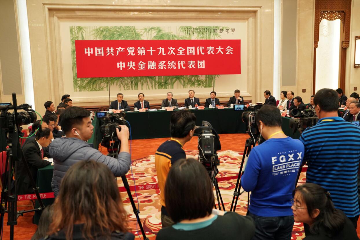 十九大中央金融系統代表團在人民大會堂一樓新聞發布廳召開討論會,一行三會負責人集體出席了此次討論會并回答了記者們的提問。