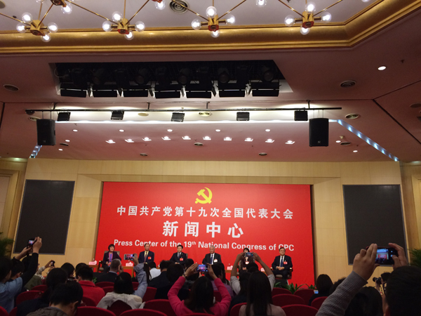 今天起,直到十九大閉幕式之前,代表們會在人民大會堂閉門討論,不對媒體開放,於是大批傳媒轉戰梅地亞新聞中心。今天這里有三場活動。主辦方體恤記者們連日來跑會的辛苦,第一場記者招待會設在上午10點才開始,行家們終於不用起太早。